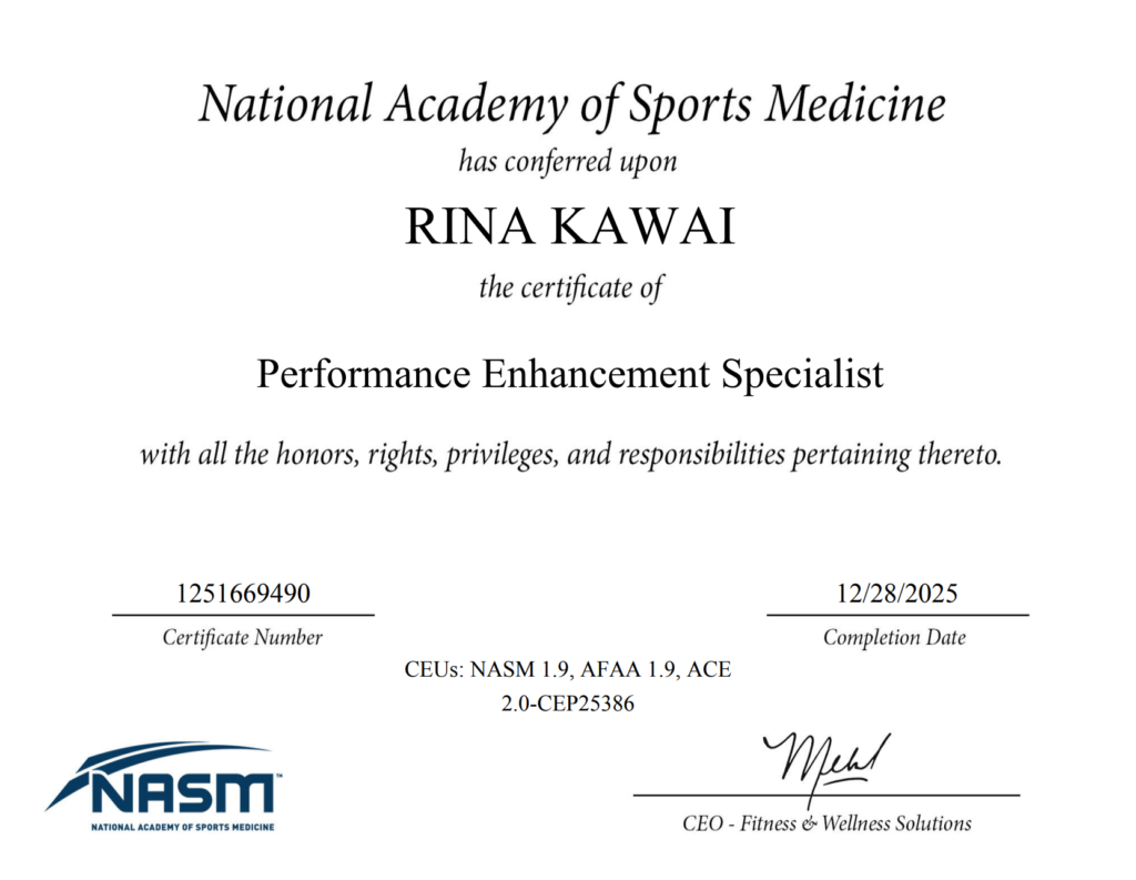 先日、スポーツトレーナーの資格「NASM-PES(全米スポーツ医学協会)」を取得しました!